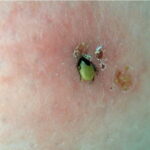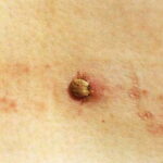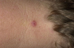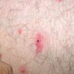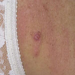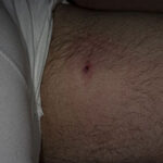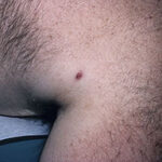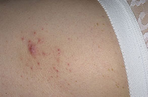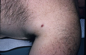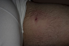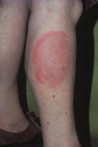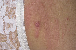 The majority of tick bites occur in the spring and summer, coinciding with the life cycle of the tick. Tick bites are usually painless, as the tick introduces an anesthetic and anticoagulant substance when biting. Often, a person will not even know he or she has been bitten but will see or feel an attached tick while scratching or bathing. Tick bites may incite foreign body granuloma formation, reactions to injected toxins and salivary secretions, and hypersensitivity responses. Rarely, delayed hypersensitivity reactions occur with fever, pruritus, and urticaria. A red papule is usually seen at the bite site, and may progress to localized swelling and erythema. A cellular response to the bite can lead to induration and nodularity after a few days. Foreign-body reactions may occur when mouth parts are retained in skin after incomplete removal of the tick. Chronic tick bite granulomas may present diagnostic problems and persist for months to years.