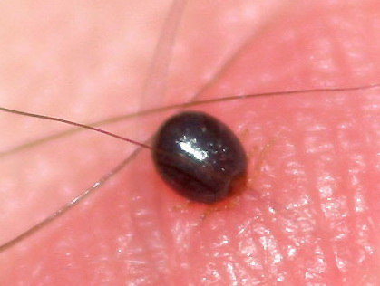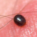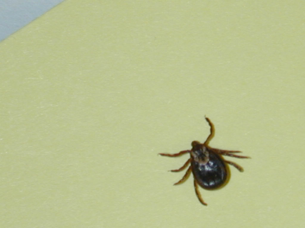 hours in search of a protected site to feed, such as a skin fold or the hairline. Tick feeding time ranges from 2 hours to 7 days, with the tick dropping off of the host once fully engorged.