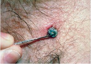 After potential exposure, the skin should be inspected for ticks to remove them before they begin feeding and risk transmitting disease. Once a tick has inserted its hypostome into the skin, it must be forcibly removed. Although many methods have been suggested for removing ticks, physical methods, such as slow, steady pulling on the tick, are probably the safest and most useful. Retained tick parts should be removed surgically if necessary to prevent development of foreign body granulomas. Antibiotic prophylaxis after tick bites is controversial. Although there is some evidence that prophylaxis may help prevent acquisition of Lyme disease and other vector-borne illnesses, the risks of antibiotic therapy must be weighed against the risks and prevalence of vector-borne illnesses in a particular region. In areas highly endemic for Lyme disease, the benefits of prophylactic treatment may outweigh the risks, especially in cases in which the tick has been attached to the host for an extended period of time and can accurately be identified as a vector for Lyme borreliosis. In these cases, the authors suggest a course of oral doxycycline .
