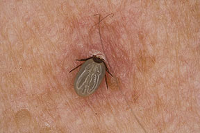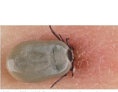 Many different tick species are responsible for local tick bite reactions and transmission of disease in human hosts. In the United States, Ixodes scapularis (deer tick or black-legged tick), Dermacentor andersoni (American wood tick), D. variabilis (American dog tick), I. pacificus (Western black-legged tick), and Amblyomma americanum (Lone Star tick) are among the most common. In the Eastern Hemisphere, important tick species include I. ricinus (castor bean tick or sheep tick) and I. persulcatus (Taiga tick). Among the diseases transmitted by ticks are Lyme disease , ehrlichiosis, babesiosis, Rocky Mountain spotted fever , Colorado tick fever, Q fever, and tularemia .