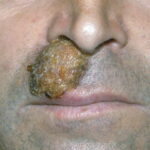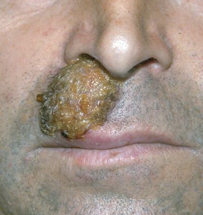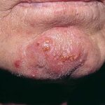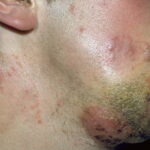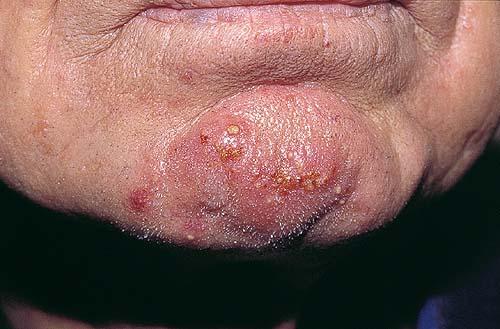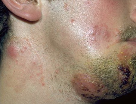 Usually caused by T. mentagrophytes and T. verrucosum, inflammatory tinea barbae  is analogous to kerion formation in tinea capitis. The lesions are nodular and boggy with a crusting seropurulent discharge. Hairs in this area are lusterless, brittle, and easily epilated to demonstrate a purulent mass about the root. Perifollicular pustulation may coalesce to form sinus tracts and abscess-like collections of pus, eventuating in a scarring alopecia.