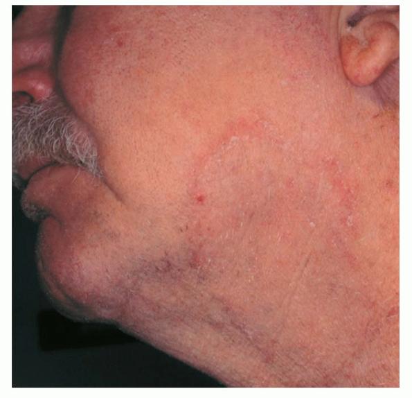 Much like tinea circinata of glabrous skin, circinate tinea barbae exhibits an active, spreading vesiculopustular border with central scaling and relative sparing of the hair