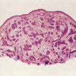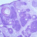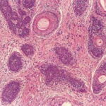 The close relationship between trichoepithelioma and basal cell carcinoma has been explained on the basis of the assumption that they have a common genesis from pluripotential cells, which, like primary epithelial germ cells, may develop toward hair structures . This hypothesis is supported by the fact that patched gene mutations are seen in both tumors . Because cells of various degrees of maturity may occur in the same lesion, trichoepithelioma may have areas consistent with the histologic picture of basal cell carcinoma and vice versa. |