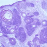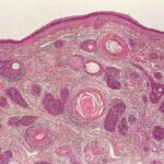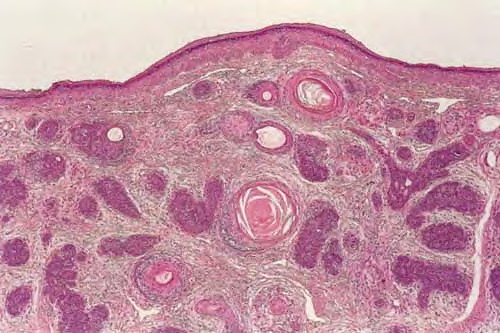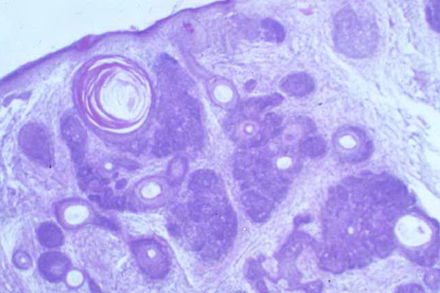 Histopathology. As a rule, multiple trichoepitheliomas are superficial dermal lesions. They appear well circumscribed, small, and symmetric on histologic examination. Horn cysts are the most characteristic histologic feature, although they may be absent in some lesions. They consist of a fully keratinized center surrounded by basophilic cells that have the same appearance as the cells in the basal cell carcinoma, except that they tend to lack high-grade atypia and mitoses, which may be prominent in some but not all carcinomas . The keratinization is abrupt and complete, in the manner of so-called “trichilemmal” keratinization, as opposed to the horn pearls of squamous cell carcinoma. Quite frequently, one observes one or a few layers of cells with eosinophilic cytoplasm and large, oval, pale, vesicular nuclei situated between the basophilic cells and the horn cysts . |