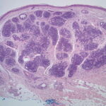 . The fibroblasts encircle and are tightly associated with the basaloid islands, lacking the retraction artifact typical of basal cell carcinoma . Both the adenoid and the solid aggregates show invaginations, which contain numerous fibroblasts and resemble follicular papillae, also known as papillary mesenchymal bodies . |