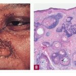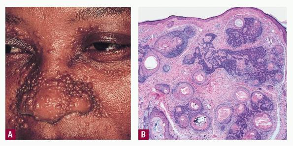 Multiple trichoepitheliomas are transmitted as an autosomal dominant trait (53). In most instances, the first lesions appear in childhood and gradually increase in number (54). Numerous rounded, skin-colored, firm papules and nodules usually between 2 and 8 mm in diameter are seen located mainly in the nasolabial folds, but also the nose, forehead, and upper lip. Occasionally, lesions are seen also on the scalp, neck, and upper trunk. Ulceration of the lesions occurs rarely. Transformation of one or several lesions into basal cell carcinomas is a very rare event. Most of the cases reported as such in the past are now regarded as instances of nevoid basal cell carcinoma syndrome (19,55). Nevertheless, there have been a few cases of basal cell carcinoma arising in the setting of multiple trichoepitheliomas . The simultaneous presence of trichoepithelioma and cylindroma, the latter of which is also dominantly inherited, has been observed repeatedly . |