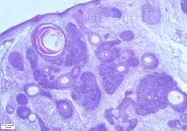 Histochemical staining with the Gomori stain for alkaline phosphatase has shown positive staining in many invaginations at the periphery of tumor islands and strands, indicative of a differentiation toward hair papillae . An immunohistochemical analysis using a panel of monoclonal anti keratin antibodies suggests that trichoepitheliomas differentiate toward the outer root sheath . The expression of cytokeratin 15 in a subset of trichoepitheliomas suggests that these tumors contain cells that are related to hair follicle stem cells in the follicular bulge . Electron microscopic study has confirmed that the horn cysts of trichoepithelioma represent immature hair structures, with abrupt development of the horn cells from hair matrix cells . |