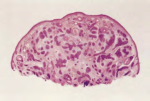 The differentiation of multiple trichoepitheliomas from the nevoid basal cell carcinoma syndrome on histologic grounds can be just as difficult. This, too, often requires clinical information. Although both diseases are dominantly inherited and have multiple lesions, the lesions in multiple trichoepitheliomas present mainly in the nasolabial fold, remain small, and hardly ever ulcerate, whereas the lesions in the nevoid basal cell carcinoma syndrome are haphazardly distributed and, especially in the late, “neoplastic” phase, can grow to considerable size, ulcerate deeply, and show severely destructive growth. In addition, patients with the nevoid basal cell carcinoma syndrome almost invariably show multiple skeletal and central nervous system anomalies and frequently show multiple palmar and plantar pits. |