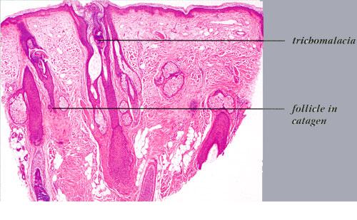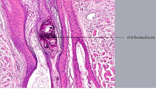 disease, the pathology shows an "end-stage" scarring alopecia, a histologic picture shared by many forms of permanent alopecia at an advanced stage. Pigment casts and trichomalacia are not seen in late traction alopecia. |