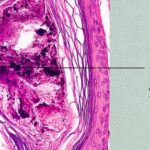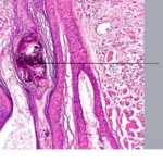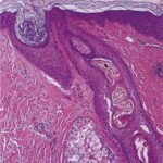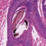 Histopathology. In horizontally sectioned biopsies of trichotillomania uncomplicated by the coexistence of other types of alopecia, the density of hair follicles is normal, as is the terminal-to-vellus hair ratio. The diagnostic finding, when seen, is distorted hair follicle anatomy, without inflammation . Specifically, the pulling of hairs can leave behind empty anagen follicles and "torn-away" follicles, the result of plucked hair shafts that retain parts of the hair matrix and root sheaths . Additional microscopic evidence of traumatic injury was published by Royer et al. as the "hamburger sign," describing a vertically oriented split in the hair shaft containing proteinaceous material and erythrocytes, resembling a hamburger within a bun . Damaged follicles enter the resting phase, leading to an increase in the percentage of catagen and telogen hairs, as high as 75% . Often the hairs do not become normal catagen hairs and appear distorted and abnormal . |