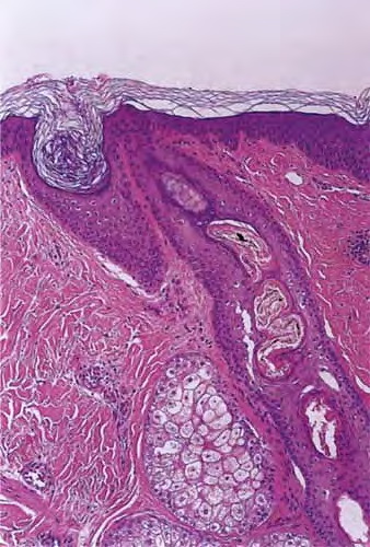Traction Alopecia Traction alopecia is another type of mechanical alopecia, usually resulting from a variety of hair-styling practices, particularly in African-Americans, that includes tight braids, corn rows, straightening, and the use of sponge rollers . Hair follicle injury is similar to that produced in trichotillomania, but in traction alopecia there are differences that relate to the use of less force over a greater period of time (194). Traction alopecia is often classified clinically and histologically as "early" and "late" disease . In early disease, tension on hair follicles exists over the course of months to a few years, sometimes presenting as a traction folliculitis with perifollicular erythema and pustules . In late disease, hair is subject to traction over many years. In early disease, discontinuation of the abnormal forces on the hair leads to regrowth of hair, but in late disease, follicles are lost, producing a permanent alopecia. Early and late disease are commonly found together in the same patient; as permanently scarred areas develop (late disease), terminal hairs at the periphery are used in styling, becoming the new target of traction (early disease) (. Occupationally related traction alopecia has been reported due to wearing of a nurse's cap, occurring at the site of pin placement used to secure the cap . Histopathology. In early traction alopecia, the histologic findings are similar to those of trichotillomania, albeit more subtle (194). For instance, the density of follicles is normal, with a normal number of vellus hairs. Premature conversion of anagen hairs to catagen occurs, resulting in an increased number of catagen and telogen follicles. Pigment casts and trichomalacia are sometimes found, although less often than in trichotillomania. Inflammation is absent. |