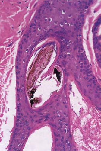 being deposited distally as the hair is plucked {194}. Pigment casts are due to injury to the hair matrix, although some authors have theorized that they result from the sudden conversion of anagen to catagen . Hair shaft changes, termed trichomalacia, may be seen. Characterized by diminished size, distorted and odd shape, and irregular pigmentation of the shaft, trichomalacia is additional evidence of trauma to the matrix . Traumatized follicles can also show considerable distortion of the bulbar epithelium and conspicuous hemorrhage . |