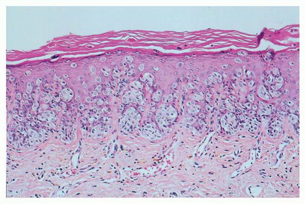 Because not all follicles in a given area are affected, transversely sectioned scalp biopsies may increase the yield of finding the diagnostic histologic features of trichotillomania, including increased numbers of catagen and telogen hairs (most cases) and empty or distorted follicles (greater than 50% of cases) (194). The same study found pigment casts and trichomalacia in less than 50% of cases. When the scalp is also rubbed persistently, epidermal changes of lichen simplex chronicus may be seen in vertical sections. |