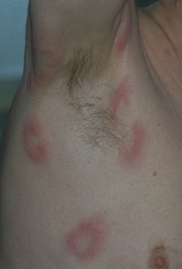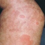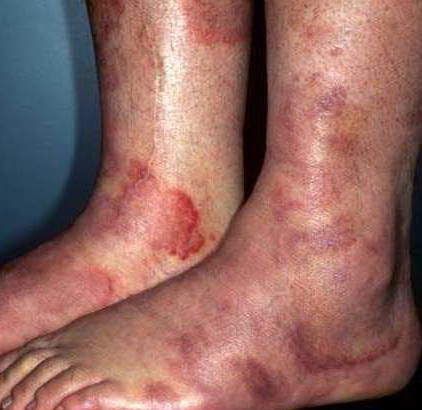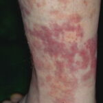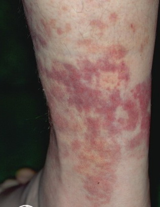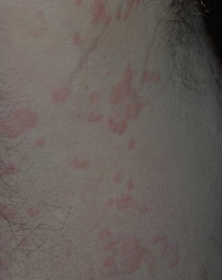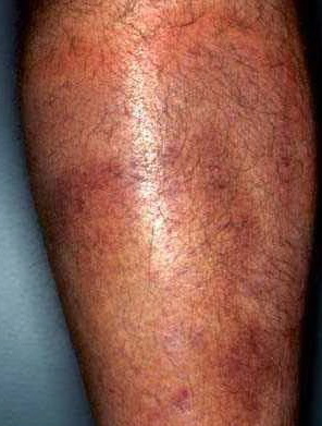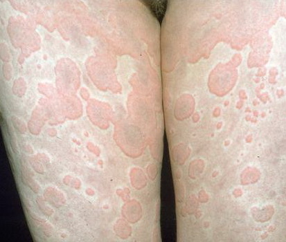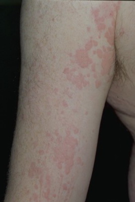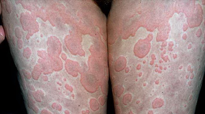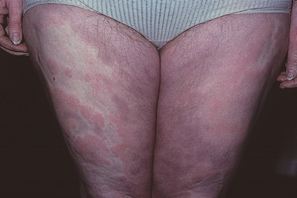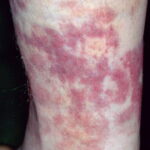 PhysicalLesions of urticarial vasculitis initially appear as erythematous wheals (see image below). As the lesions progress, purpura may develop. Often, the urticarial vasculitis lesions resolve with postinflammatory pigmentation. Annular or targetoid lesions may be observed.