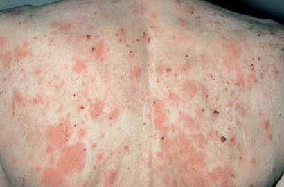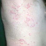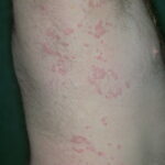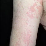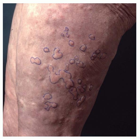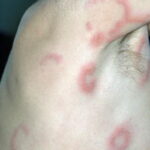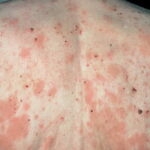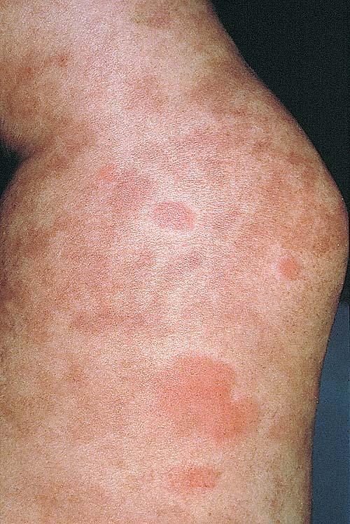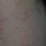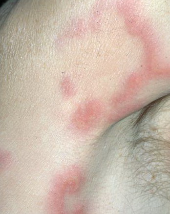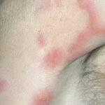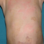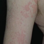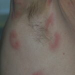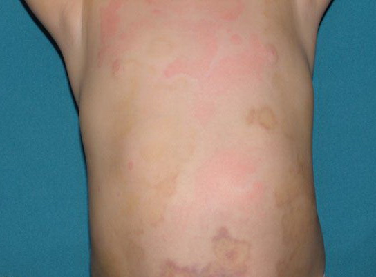 HistoryPatients with urticarial vasculitis present with an urticarial eruption, often accompanied by a painful or burning sensation. Lesions are generalized wheals or erythematous plaques, occasionally with central clearing, lasting for more than 24 hours in a fixed location (in contrast to urticaria, which resolves in minutes to hours or migrates continually). Petechiae may be noted within the lesions, and they may resolve with ecchymoses or postinflammatory hyperpigmentation. Patients may have photosensitivity, lymphadenopathy, arthralgia, angioedema (40%), fever, abdominal pain, dyspnea, and pleural and pericardial effusions.4 Most cases of urticarial vasculitis are idiopathic.