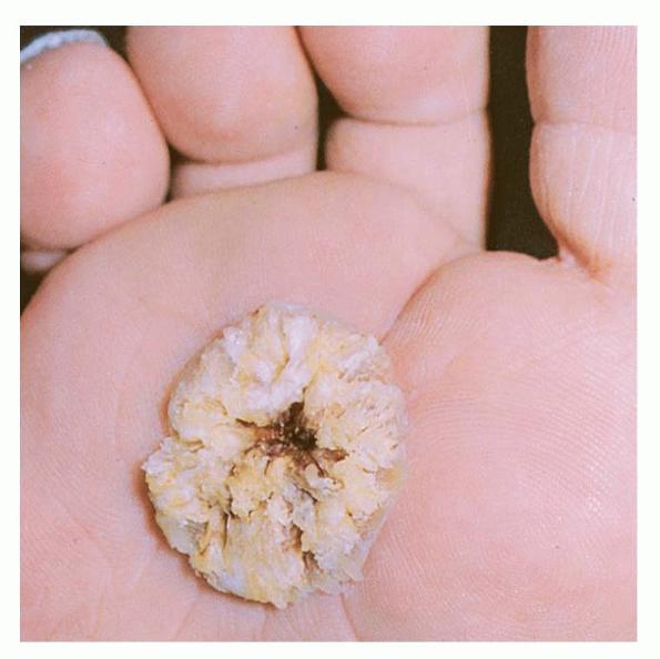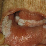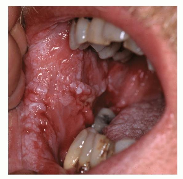 - The more fully developed lesions are white, soft, cauliflowerlike papillomas with a pebbly surface that may extend and coalesce over large areas of the oral mucosa.