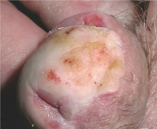 - The Buschke-Löwenstein tumor is preferentially seen in men and immunocompromised patients.10 It commonly occurs on the glans penis, mainly in uncircumcised men.