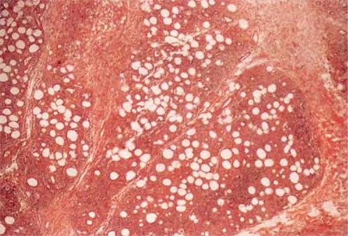 The histopathologic appearance itself is not sufficiently specific to exclude other diseases . The classical description of the disease is that it evolves through three stages. In the first phase, there is only erythema and induration clinically. Histologically, acute inflammation is found in the fat lobules with degeneration of fat cells and an infiltrate of neutrophils, lymphocytes, and macrophages. The second phase has an infiltrate discretely localized to the fat lobules, consisting mainly of macrophages, foam cells, and extracellular lipid droplets. In some cases, the lesions perforate the skin surface and discharge a sterile, oily liquid. The third phase