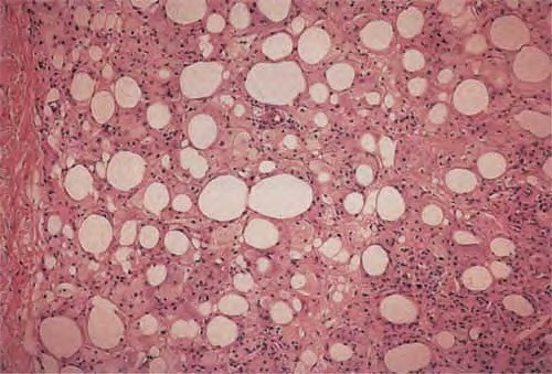 has depressed and indurated clinical lesions. Fibroblasts, collagen, and scattered lymphocytes and a few plasma cells replace the fat. Vascular changes are mild  .