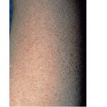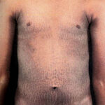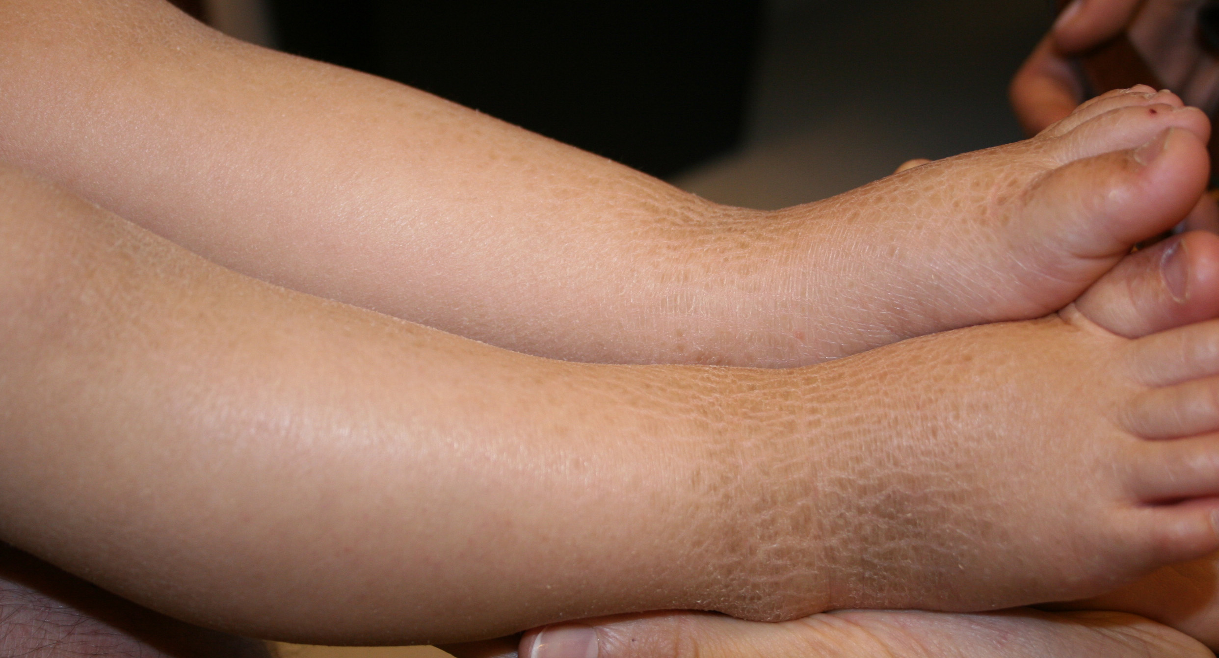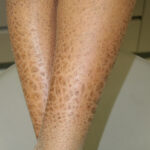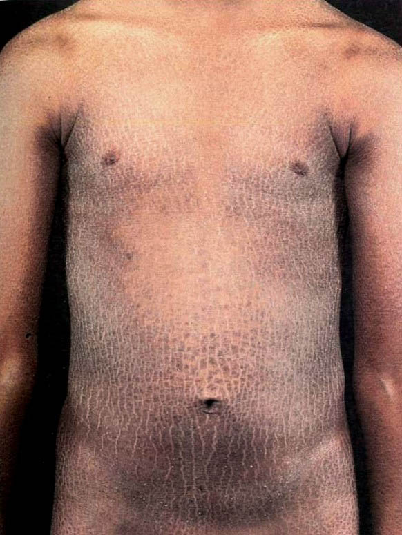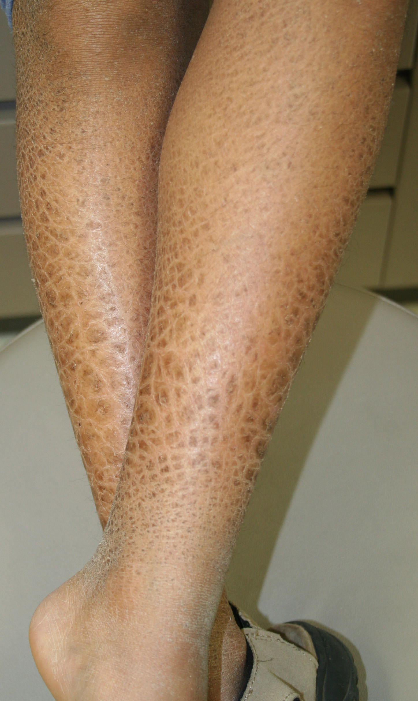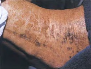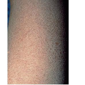 X-linked recessive ichthyosis occurs in approximately 1 in 2000 to 6000 males. Scaling may begin in the newborn period and is usually most prominent on the extensor surfaces, although there is significant involvement of the flexural areas. Although the extent and degree of scaling are variable, X-linked ichthyosis can usually be distinguished from ichthyosis vulgaris on clinical criteria. The latter tends to be associated with hyperlinear palms and soles, keratosis pilaris, and a family history of atopy. X-linked ichthyosis tends to have more severe involvement with larger scale, and comma-shaped, corneal opacities may be present in one-half of adult patients Corneal opacities do not affect vision and may be present in female carriers. Affected males have an increased risk of cryptorchidism and, independently, they are