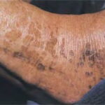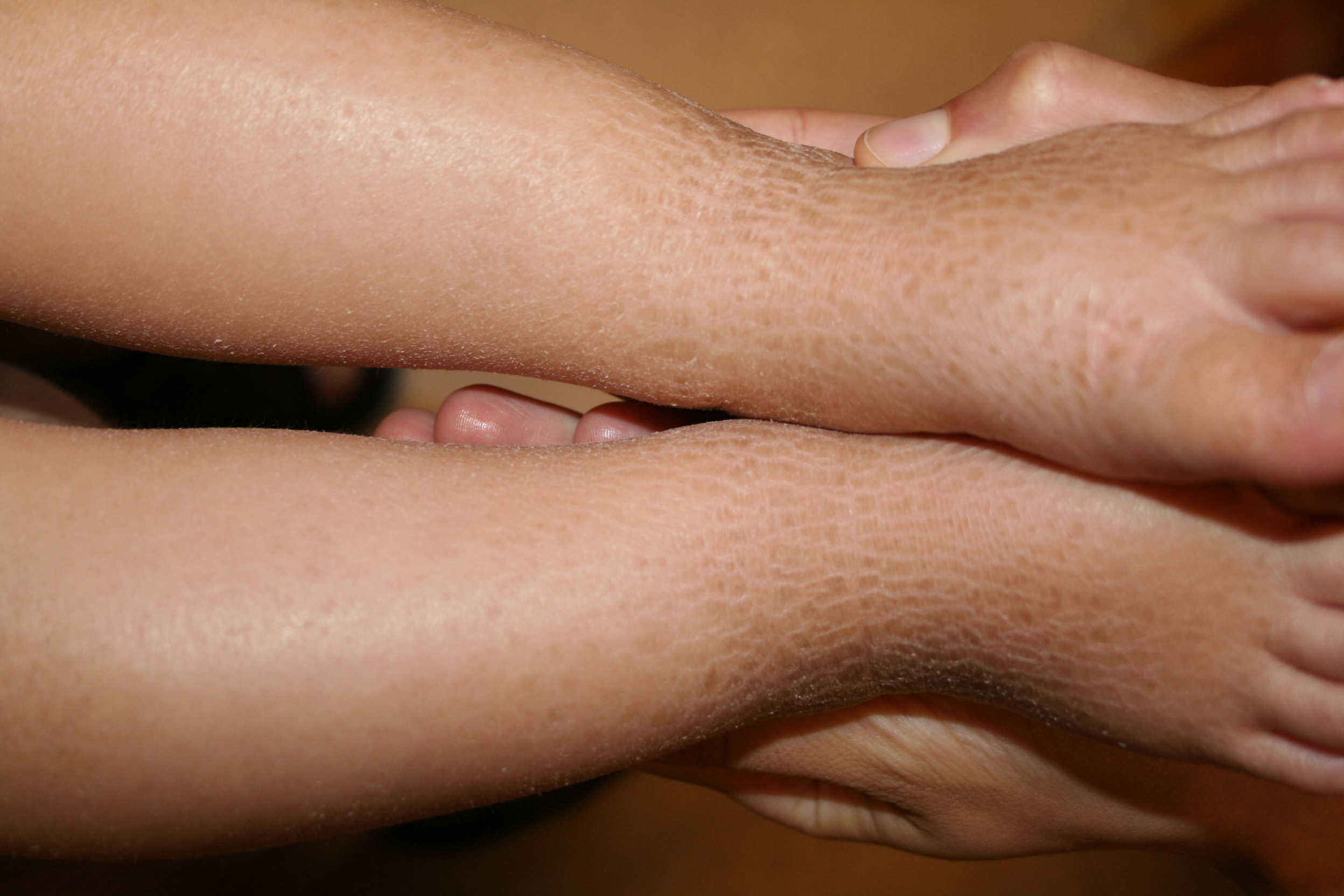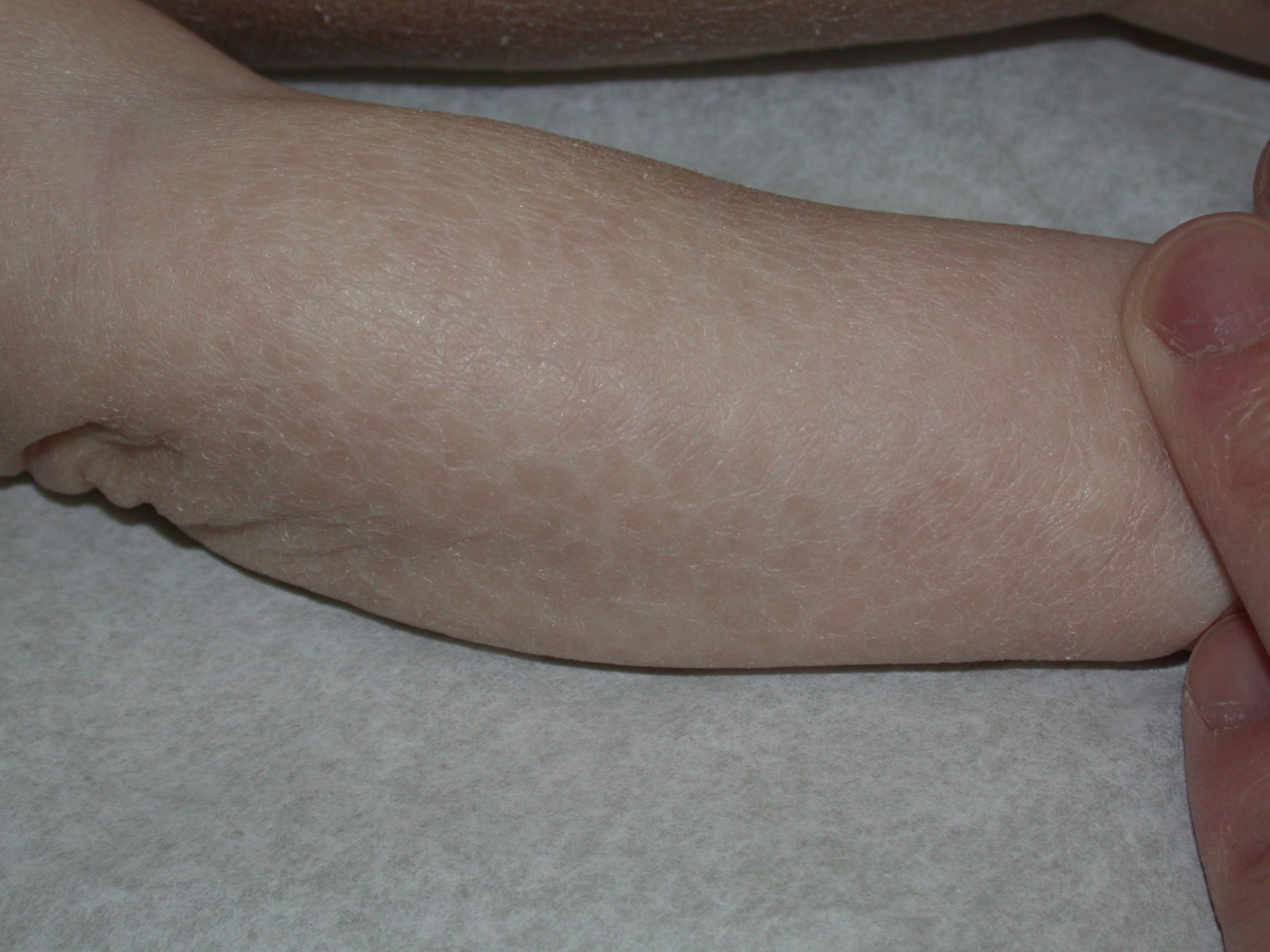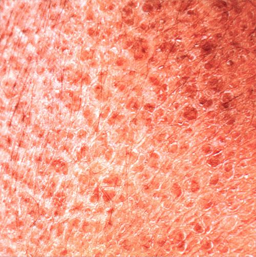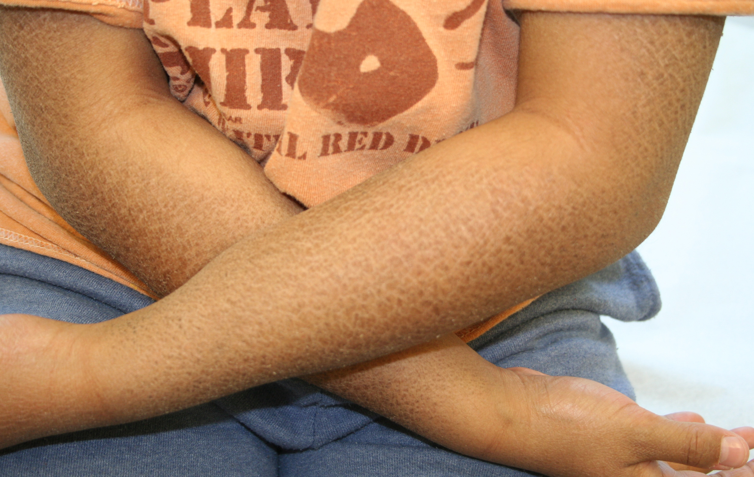 X-linked recessive ichthyosis occurs in approximately 1 in 2000 to 6000 males. Scaling may begin in the newborn period and is usually most prominent on the extensor surfaces, although there is significant involvement of the flexural areas. Although the extent and degree of scaling are variable, X-linked ichthyosis can usually be distinguished from ichthyosis vulgaris on clinical criteria. The latter tends to be associated with hyperlinear palms and soles, keratosis pilaris, and a family history of atopy. X-linked ichthyosis tends to have more severe involvement with larger scale, and comma-shaped, corneal opacities may be present in one-half of adult patients Corneal opacities do not affect vision and may be present in female carriers. Affected males have an increased risk of cryptorchidism and, independently, they are